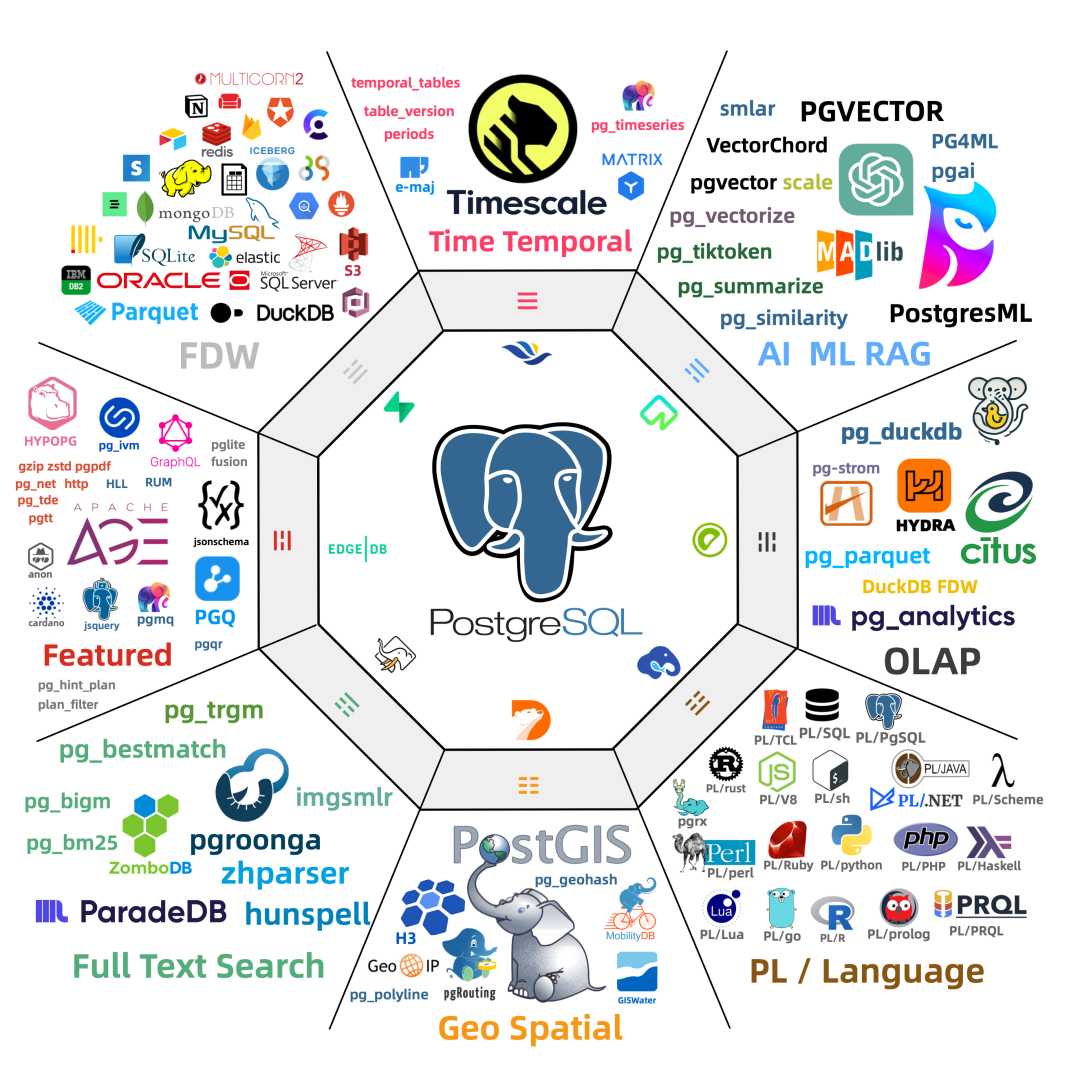 诚然 PostgreSQL 先进,但 Oracle 也先进;PostgreSQL 开源,但 MySQL 也开源。PostgreSQL 先进且开源,这是它与 Oracle MySQL 竞争的底气,但要说其独一无二的特点,那还得是它的极致可扩展性,与繁荣的扩展生态!