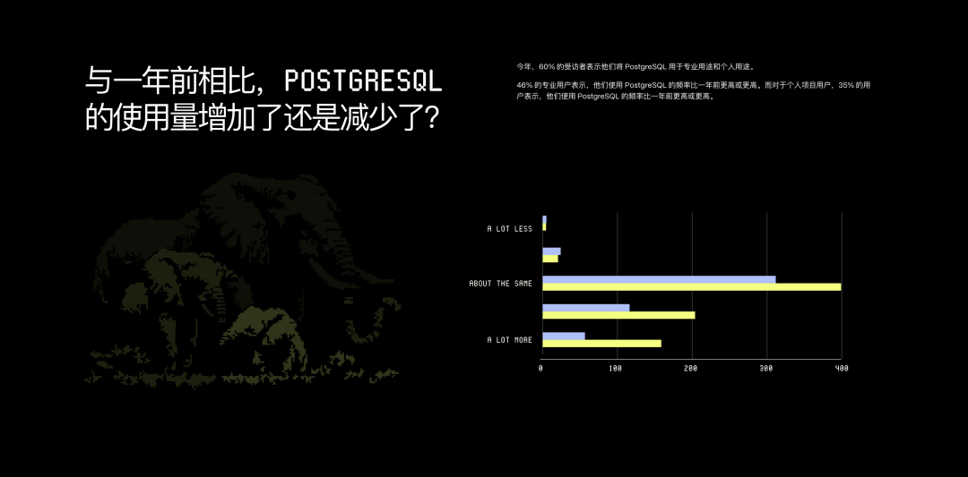 46% 的专业用户表示,他们使用 PostgreSQL 的频率比一年前更高或更高。而对于个人项目用户,35% 的用户表示,他们使用 PostgreSQL 的频率比一年前更高或更高。