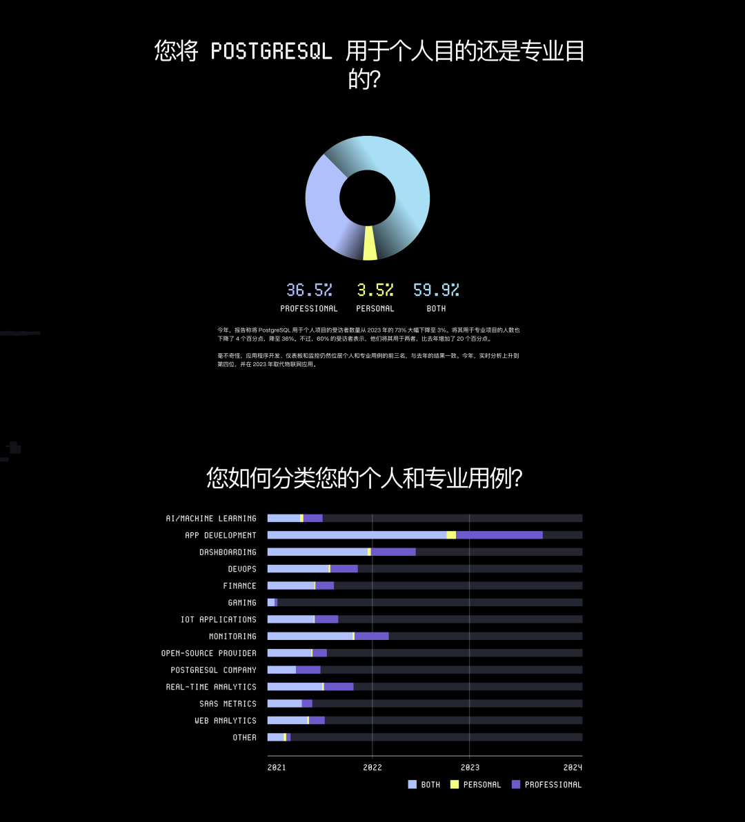 用例部分可能是这份报告最有价值的部分之一。与去年 2023 相比,今年 PostgreSQL 的用例场景不再是 应用开发(App Development) 一枝独秀,而是在细分领域全面铺开。