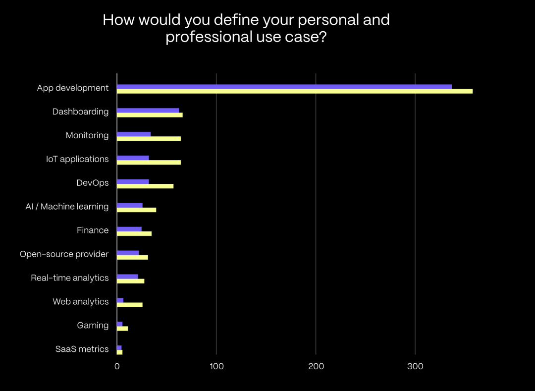 前三大用例依然是 应用程序开发,仪表盘,监控。而今年的一个变化是 实时分析上升到了第四位,取代了原本物联网 IOT 场景的位次。