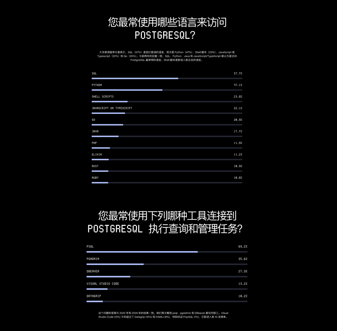 大多数调查参与者表示,SQL(57%)是他们首选的语言,其次是 Python(47%)、Shell 脚本(23%)、JavaScript 或 Typescript(22%)和 Go(20%)。与前两年的回复一致,SQL、Python、Java 和 JavaScript/TypeScript 被认为是访问 PostgreSQL 最常用的语言。Shell 脚本是新进入前五名的语言。