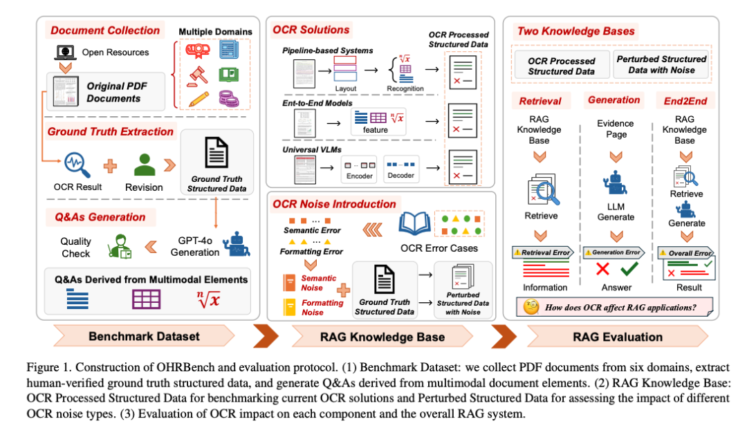 研究团队创建了OHRBench,这是首个用于理解OCR对RAG系统级联影响的基准,包含350份来自六个实际应用领域的非结构化PDF文档,以及基于文档中多模态元素的问答对。研究识别了两种OCR噪声类型:语义噪声和格式噪声,并通过扰动生成不同程度的噪声数据集。研究使用OHRBench全面评估了当前的OCR解决方案,发现没有一种方案能够构建高质量的RAG系统知识库,并系统地评估了这两种噪声类型的影响,揭示了RAG系统的脆弱性。此外,研究还讨论了在RAG系统中使用无需OCR的视觉语言模型(VLMs)的潜力。