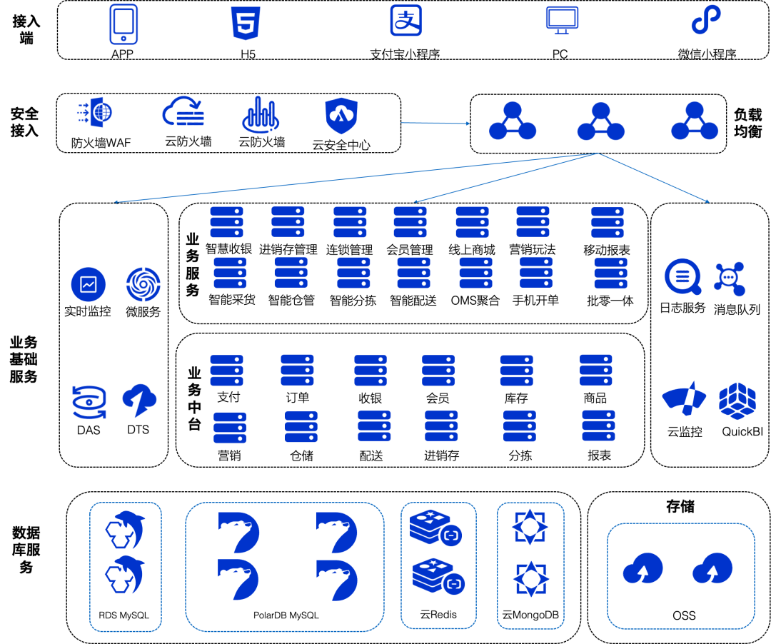 这些复杂查询分析场景涉及的数据量巨大,单个OLAP查询需要执行TB级别的数据,消耗大量CPU和IO资源,伴随出现了不同客户的查询干扰问题。大客户数据量、并发量增长之后,由于单次查询慢,报表的并发能力急剧下降,使用体验下降。经过多轮的调研和与阿里云PolarDB团队的沟通交流,出于兼容性、易用性、查询提速能力、弹性、成本等方面的考虑,乐檬决定将数据迁移到PolarDB MySQL版来解决这些问题。乐檬主要看中PolarDB的IMCI、读写分离一致性读、Serverless、共享存储大存储等特性,在较好地解决当前问题的同时,也给乐檬未来的技术架构演进提供了较好的扩展性。当前,乐檬使用PolarDB实例超50个,总数据量超过300TB,这些实例用于以零售ERP为核心的全渠道会员、智慧收银、线上商城、订单管理、营销、移动报表等乐檬全系列业务中。核心产品门店收银管理、连锁门店ERP管理系统、采购配送系统、客户营销分析系统、新零售管理系统、WMS仓储管理系统等主要使用PolarDB MySQL版来支撑业务的高并发读写和未来的架构扩展。乐檬阿里云技术架构图