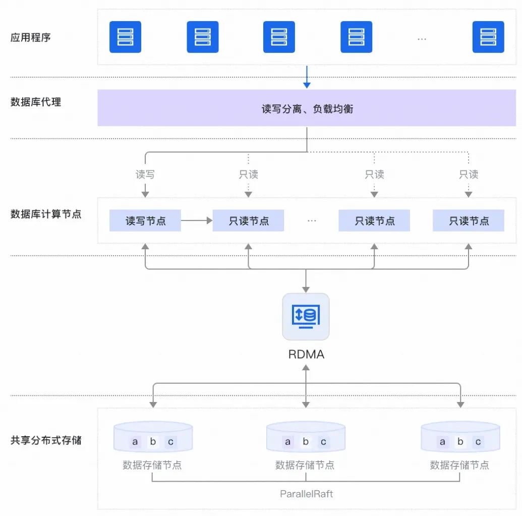 PolarDB基于云原生设计理念,采用分布式集群架构,一写多读,一个集群包含一个主节点和最多15个只读节点。主节点处理读写请求,只读节点仅处理读请求。主节点和只读节点之间采用Active-Active的Failover方式,提供数据库的高可用服务。多个计算节点共享一份数据,基于全新打造的分布式块存储(Distributed Storage)和文件系统(Distributed Filesystem),存储容量可以在线平滑扩展,不会受到单个数据库服务器的存储容量限制,可应对上百TB级别的数据规模。