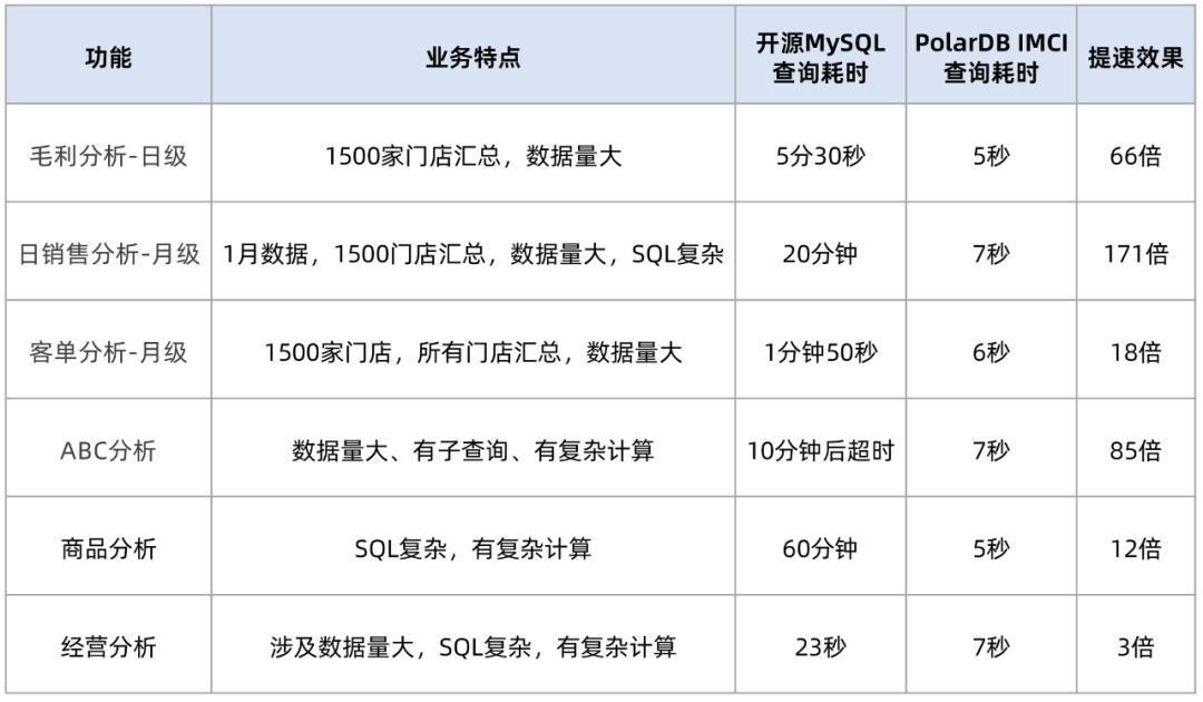 从以上架构图可以看到,PolarDB MySQL引擎从存储引擎、执行算子、优化器三个层面设计了列存索引的特性:在此架构下,PolarDB MySQL版具备如下优势:100%兼容MySQL:列存具有与MySQL一致的数据类型系统,支持灵活的类型转换,100%兼容MySQL协议,结合自动读写分离技术团队基本可以做到代码无改动提高查询分析速度。自动分离:PolarDB提供的自动SQL分流功能,自动将复杂查询指向分析型只读节点,业务无需对OLTP型SQL和OLAP型SQL进行手动分流。极致的HTAP性能:在大部分场景下IMCI可以做到提速10倍~百倍,分析性能最高是开源MySQL数据库的400倍。行列混合存储,降低成本:同时支持行存储和列存储两种格式,且实时保证行列的事务级一致,同时,列存更具有低成本的优势。使用简单:在业务库表上购买IMCI节点,在表上增加列存索引,通过集群地址访问即可完成标签、智能营销功能的提速。这些能力帮助乐檬数据研发团队极大地提升研发速度,从而助力大幅度优化会员管理系统、进销存单据系统、移动报表,满足这几个业务模块对数据库提速的诉求。使用列存索引后SQL查询性能最高提升170倍,大部分复杂SQL查询性能可以提速10倍以上。同时借助PolarDB Proxy节点的智能路由能力,OLAP查询可以自动路由至PolarDB IMCI节点并选择列存索引执行SQL,做到了OLTP和OLAP架构一体化的体验,并提高了业务系统和报表系统的复杂查询性能,其中典型功能提速效果如下: