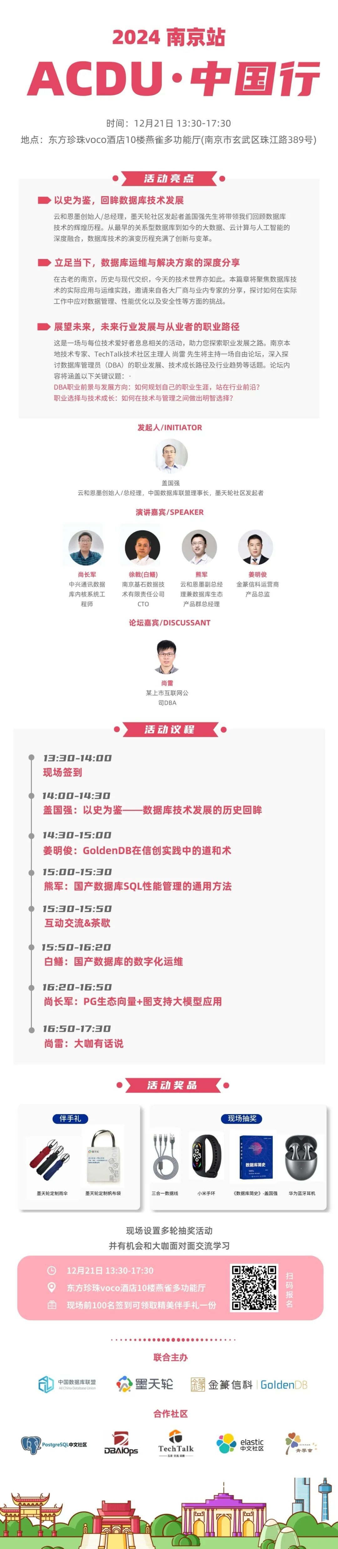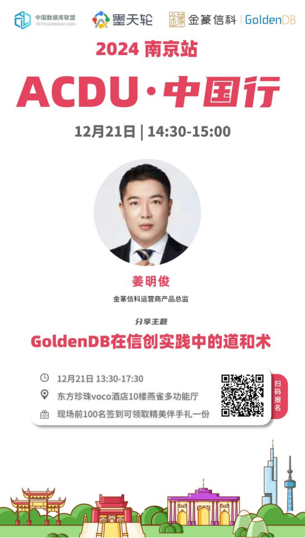 在【ACDU中国行·南京站】,云和恩墨创始人/总经理,墨天轮社区发起者盖国强先生将带领我们回顾数据库技术的辉煌历程。金篆GoldenDB运营商产品总监姜明俊将做主题演讲,分享《金篆GoldenDB在信创实践中的道与术》。此外,来自各大厂商的业内专家将深度分享数据库技术的实际应用与运维实践,并展望数据库行业与从业者的未来发展路径。