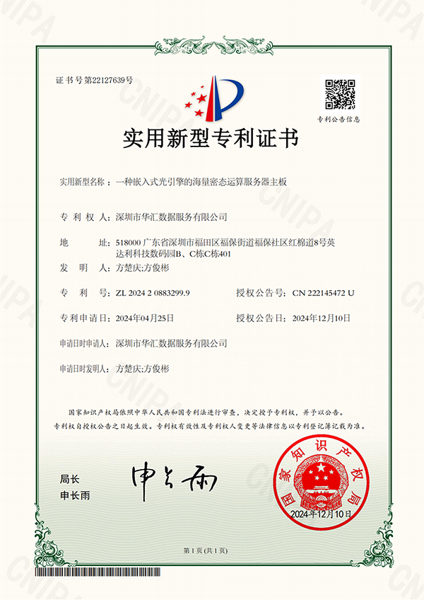 日前,深圳市华汇数据服务有限公司自主研发的“一种嵌入式光引擎的海量密态运算服务器主板”,获得国家知识产权发明专利授权,标志着公司在创新发展之路的又一突破!