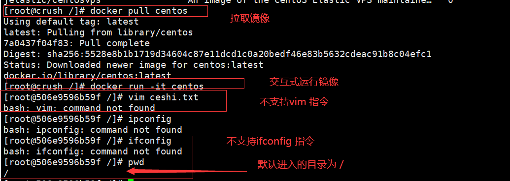 docker pull centos # 拉取镜像docker run -it centos #运行镜像# ===== 测试====vim ceshi.txtifconfig pwd