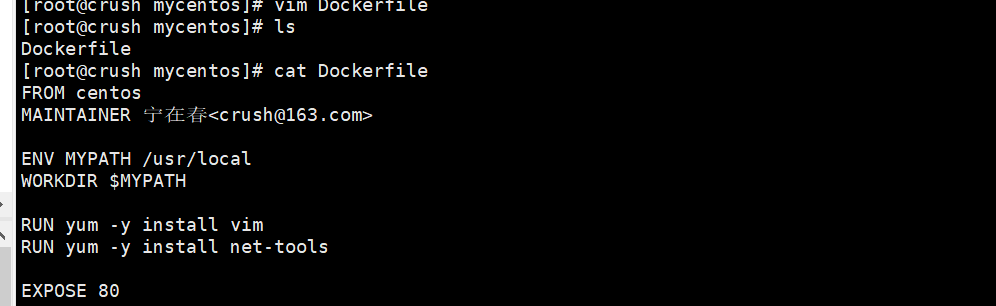 FROM centosMAINTAINER 宁在春<crush@163.com>ENV MYPATH /usr/localWORKDIR $MYPATHRUN yum -y install vimRUN yum -y install net-toolsEXPOSE 80 CMD echo $MYPATHCMD echo "success"CMD /bin/bash #只会运行最后一个