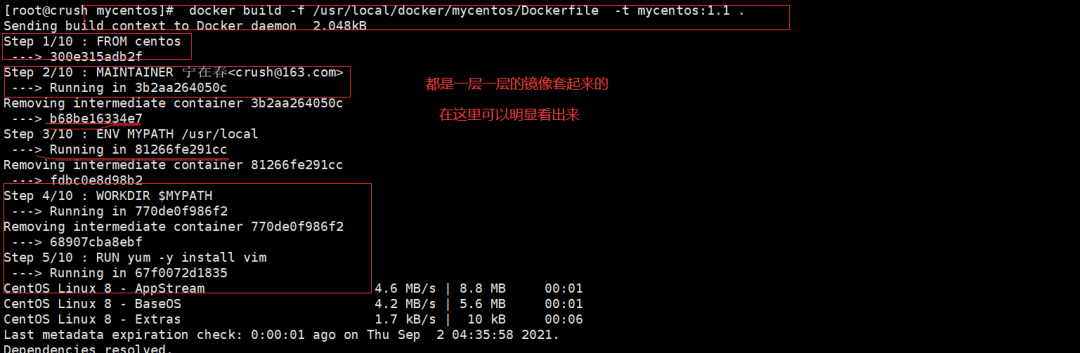 在这里也可以看出来,镜像它是由Dockerfile文件中的指令,一层一层构建出来的。