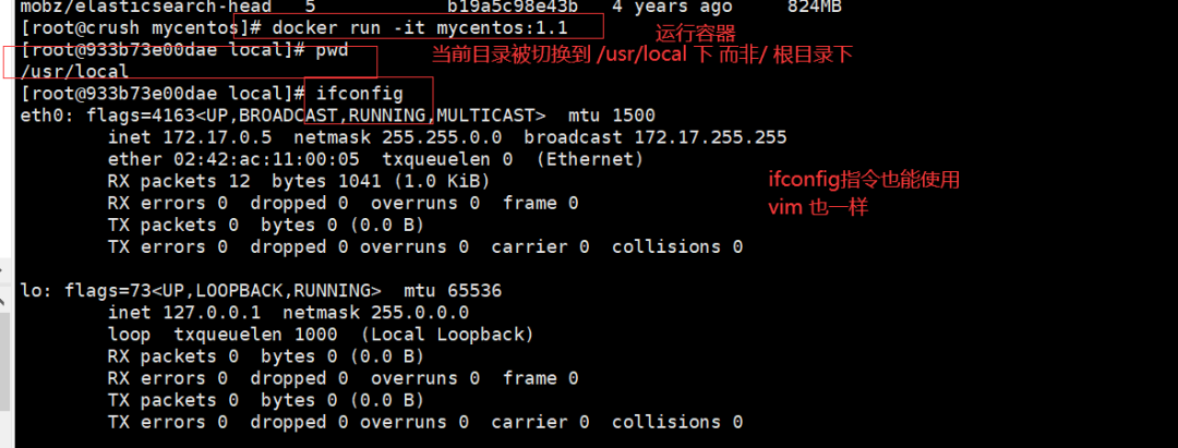 docker run -it mycentos:1.3pwdifconfig