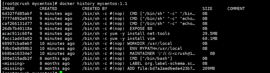 docker history mycentos:1.1