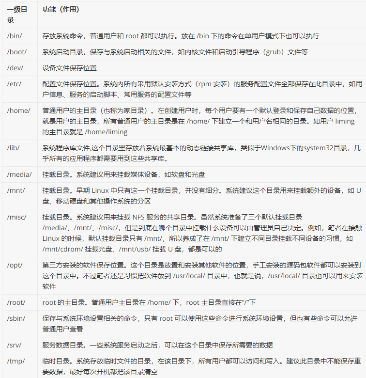 FHS 针对根目录中包含的子目录仅限于表 1,但除此之外,Linux 系统根目录下通常还包含表 2 中的几个一级目录。