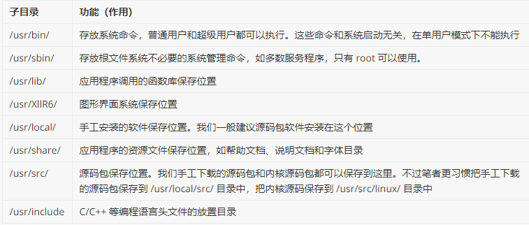 Linux 系统中,所有系统默认的软件都存储在 /usr 目录下,/usr 目录类似 Windows 系统中 C:\Windows\ + C:\Program files\ 两个目录的综合体。