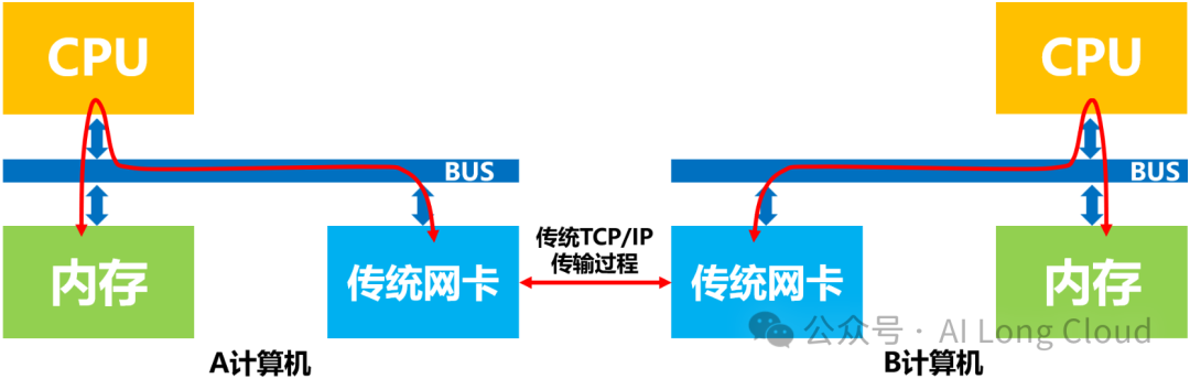 传统网络中,A计算机给B计算机发送数据,实际上需要做的是”把A计算机内存中的一段数据,通过网络链路搬移到B计算机的内存中”,而这一过程无论是发送端还是接收端,数据都是需要经过CPU,包括CPU对网卡的控制,中断的处理,报文的封装和解析等等。