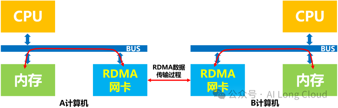 而引入RDMA技术之后呢,数据就可以绕开CPU通过RDMA网卡直接进行内存访问,从而大大提高了数据的传输速率和减少了时延。同时也大大的释放了CPU的工作负载和”压力”,提升了计算的工作效率。如下图所示: