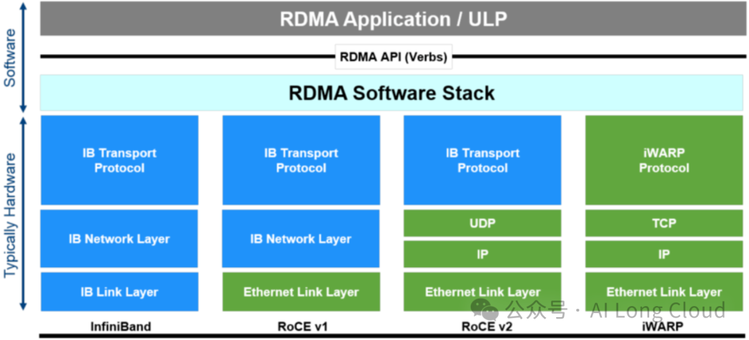 iWARP:iWARP基于TCP/IP协议的RDMA技术,由IETF标准定义。iWARP支持在标准以太网基础设施上使用RDMA技术,而不需要交换机支持无损以太网传输。因为TCP是面向连接的可靠协议,这使得iWARP在面对有损网络场景(可以理解为网络环境中可能经常出现丢包)时相比于RoCE v2和IB具有更好的可靠性,在大规模组网时也有明显的优势。但是大量的TCP连接会耗费很多的内存资源,另外TCP复杂的流控等机制会导致性能问题,所以从性能上看iWARP要比UDP的RoCE v2和IB差。