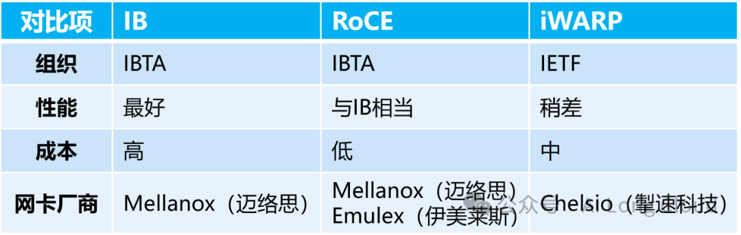 ROCE:ROCE基于以太网链路层的协议,v1版本网络层仍然使用了IB规范,而v2使用了UDP+IP作为网络层和传输层,使得数据包也可以被路由。RoCE可以被认为是IB的“低成本解决方案”,将IB的报文封装成以太网包进行收发。由于RoCE v2可以使用以太网的交换设备,所以现在在企业中应用也比较多,但是相同场景下相比IB性能要有一些损失。