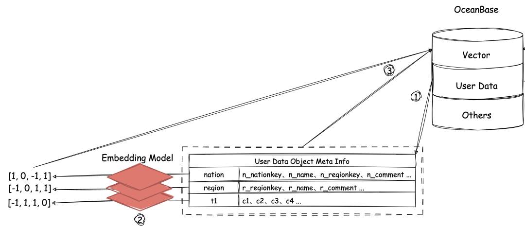 DB-GPT 每创建一个新的 User Data 库的连接,就会在 OceanBase 的 Vector 库内创建一张叫做<database_name>_profile 的表,(<database_name>替换为用户使用的数据库名),表中有一个 document 列,用于存储元数据的文本信息;还有一个 embedding 列,用于存储将 document 列转换成的 1024 维向量。
