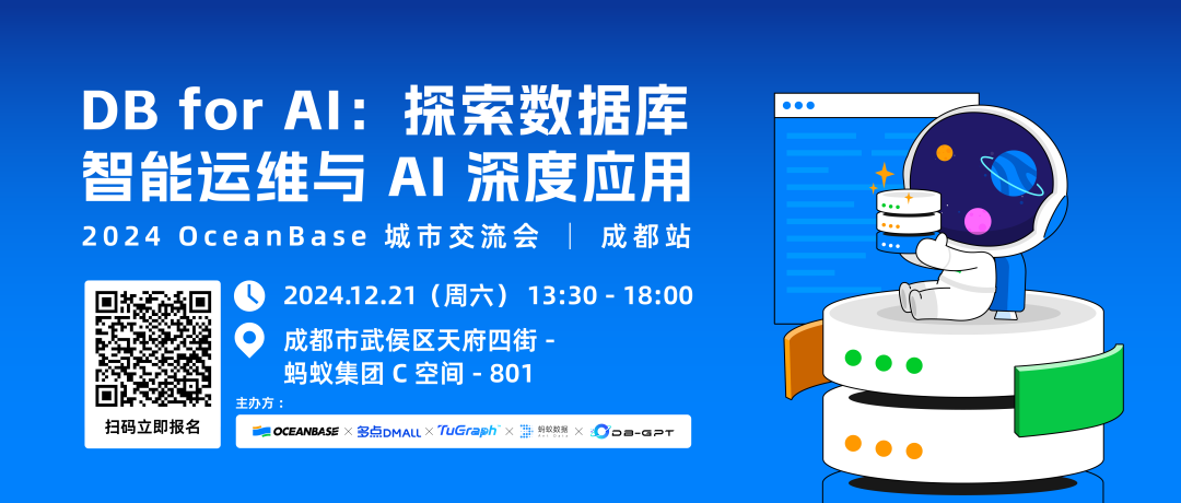 本周六(12 月 21 日),我们在成都的 OceanBase 城市交流会《探索数据库智能运维与 AI 深度应用》中,也将与DB-GPT 团队一起带来此次 chat data 的线下实验,欢迎大家参与体验。活动中还将有多点 Mall、青岛雨诺、厦门科拓、书声科技等企业的专家,一起分享更多的应用实践。赶快扫码报名吧!