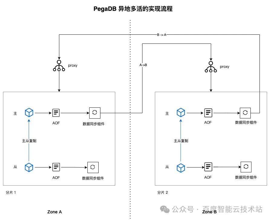 在异地多活集群中,每个实例都会为其配置一个数据同步组件,这个同步组件的叫做 SyncAgent。单个分片内部,只有主节点的 SyncAgent 会工作。SyncAgent 会解析 Redis 生成的 AOF 并将增量的 AOF 同步到目标集群。