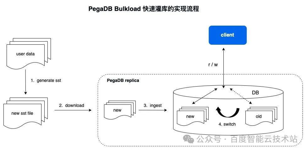 生成 SST 文件:借助百度智能云 MapReduce 平台 BMR ,业务向 BMR 平台提交 MR 作业,业务需要指定两个 BOS 地址,分别为原始 KV 数据文件 BOS 地址和生成 SST 文件输出的 BOS 地址。MR 作业的功能是将原始 KV 数据转化为 PegaDB 能够识别和加载的 SST 文件。