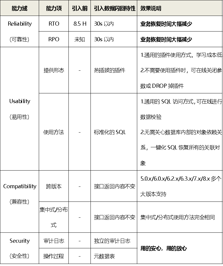 以 15TB 的数据库,500MB/s 的恢复速度为例,引入数据闪回特性前后的效果展示如下: