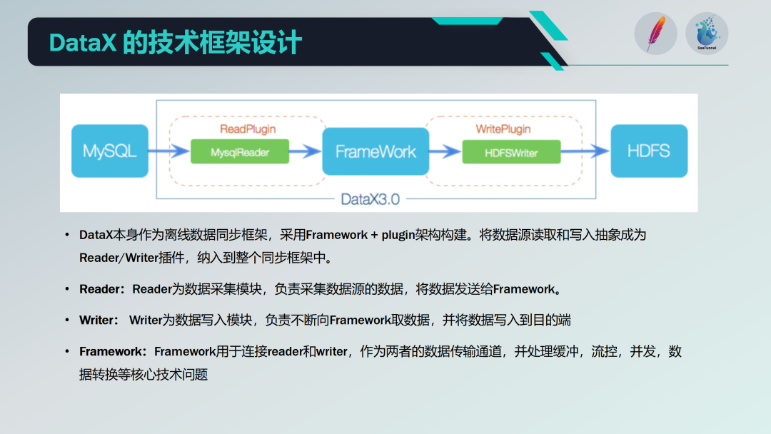 DataX: 更适合传统T+1批量数据同步场景。 Apache SeaTunnel: 支持批流一体,适用于离线同步和实时同步的混合场景。