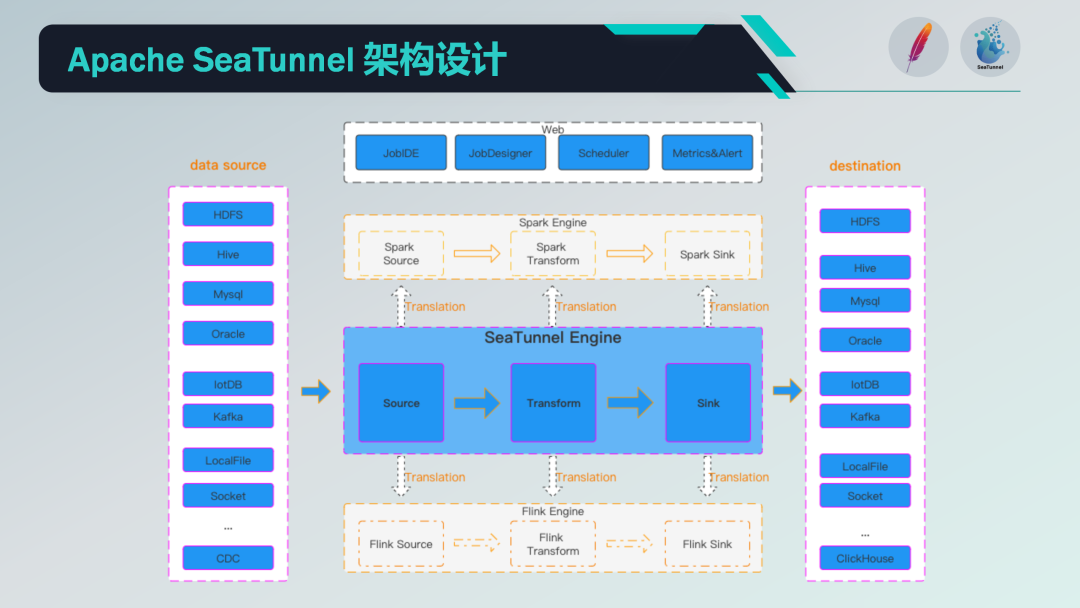 Apache SeaTunnel 的架构同样由三大核心模块组成,功能上与DataX的Reader、Framework、Writer模块一一对应:
