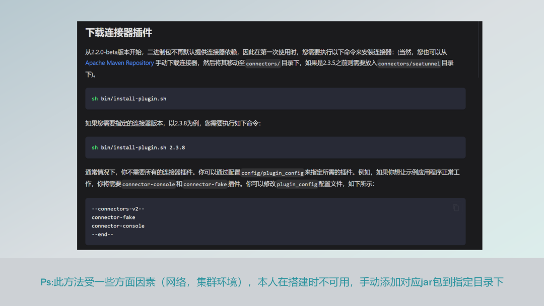建议直接从SeaTunnel的官方页面或GitHub仓库下载需要的连接器Jar包。 下载时需注意: 选择正确的版本: 确保连接器版本与SeaTunnel版本一致。 下载必要的连接器: 例如Oracle、MySQL等常用数据库的连接器。