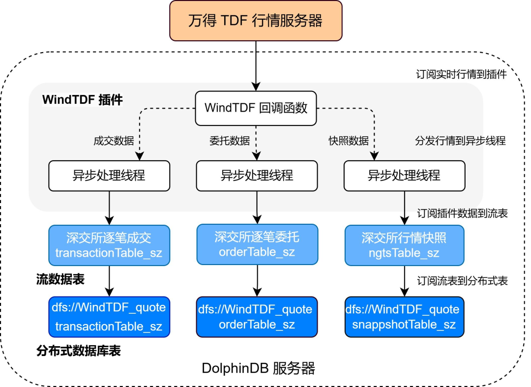 首先,我们通过 WindTDF 插件订阅上海深圳市场的成交数据、委托数据和快照数据,并将这些数据写入 DolphinDB 的持久化流数据表中。接着,我们订阅这些流表中的数据,并将其写入 DolphinDB 的分布式数据库中进行持久存储。具体方案如下图所示: