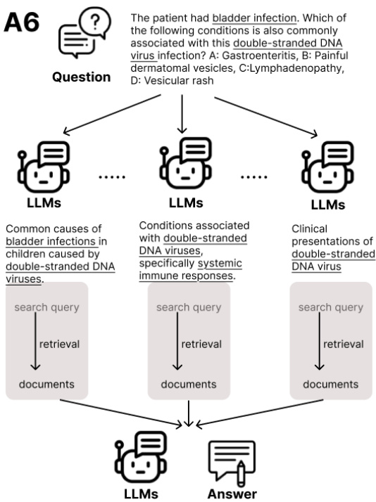 A6:搜索查询生成和信息检索:根据初始问题生成搜索查询,并进行信息检索,将检索到的文档作为上下文,以丰富推理轨迹并支持生成更全面和相关的最终答案。其过程如下图所示: