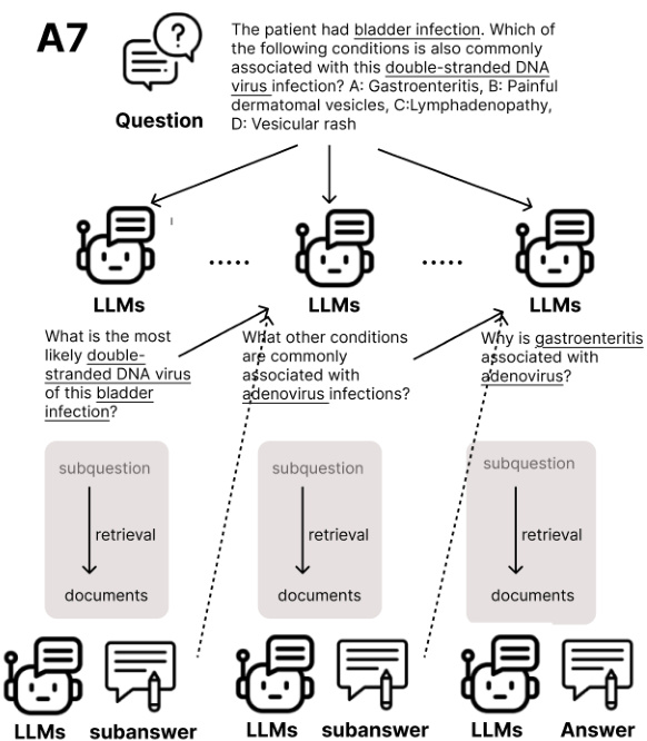 A7:子问题检索和重新回答:针对通过操作 A3 生成的子问题进行细化,为每个子问题检索特定信息,并使用检索到的信息重新回答子问题,从而提高中间推理步骤的准确性,并确保整个推理轨迹的一致性和事实可靠性。其过程如下图所示: