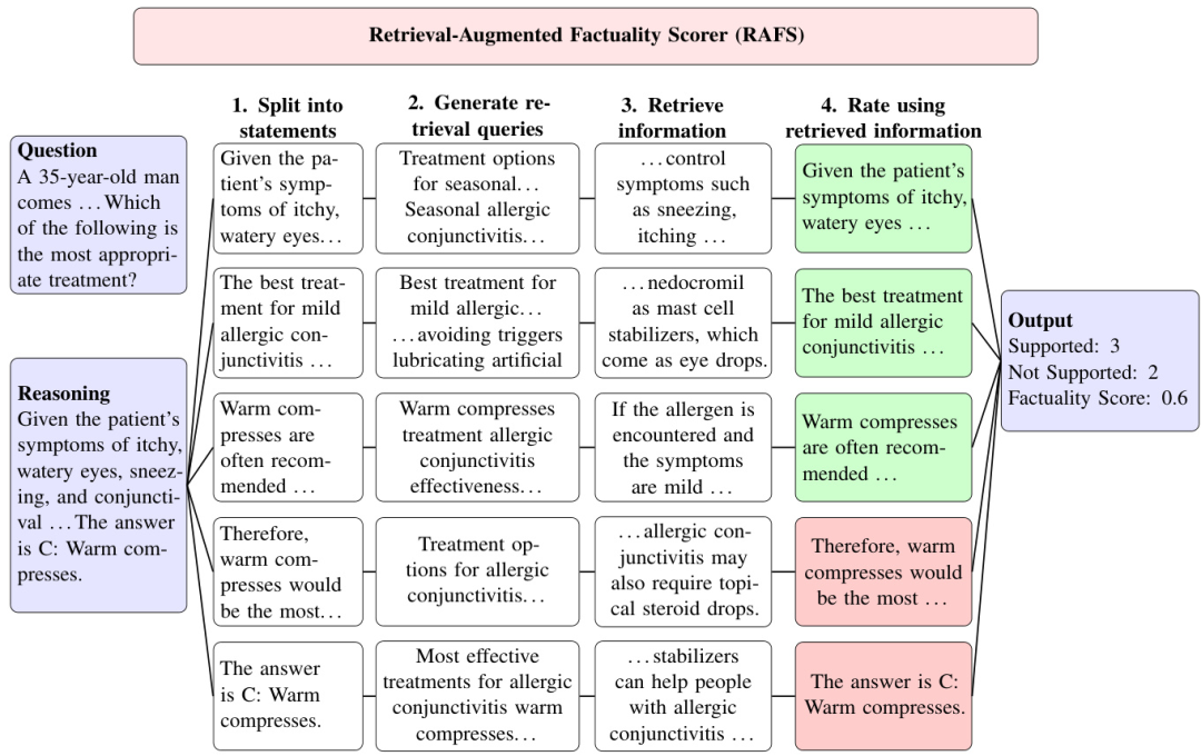 4. 使用检索信息进行评分(Rate using retrieved information):每个语句都与检索到的证据进行比较,并根据其与信息的对齐程度标记为“支持”或“不支持”。推理路径的整体事实得分是支持语句的比例,表示轨迹的事实可靠性。