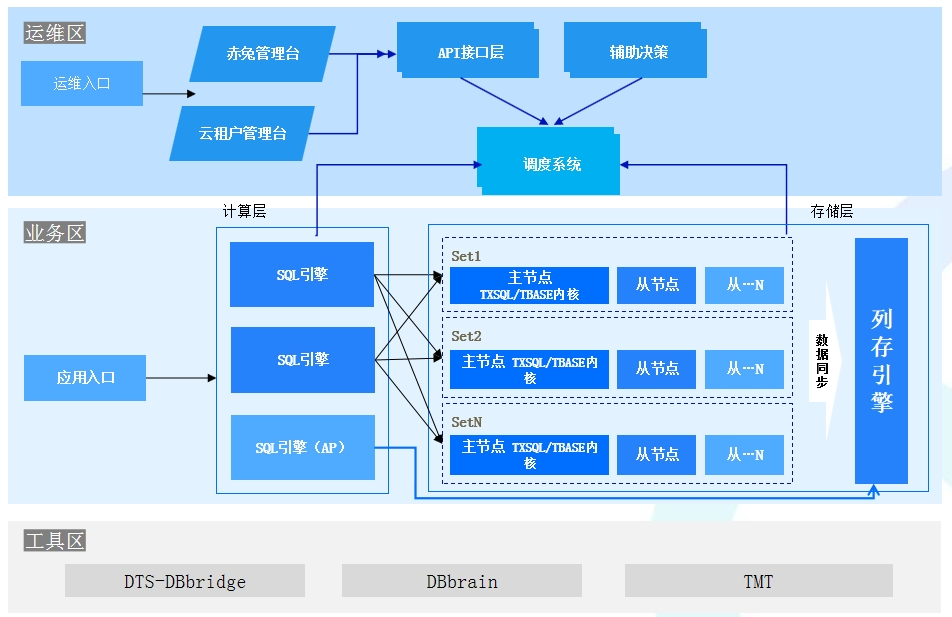 资源管理。实现资源池与租户之间的隔离管理,支持AP(分析处理)/TP(事务处理)多引擎混合部署,覆盖实例从创建到退役的全生命周期管理,并能在机器故障时执行整机迁移,保障服务连续性。