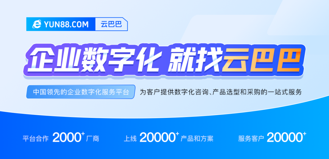 云巴巴(Yun88.com)是中国领先的企业数字化服务平台,为客户提供数字化咨询、产品选型和采购的一站式服务,平台合作2000+厂商,上线20000+产品和方案,100+的数字化咨询顾问,致力于实现客户数字化转型的降本增效。