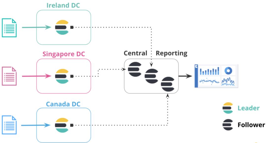 将数据安置在更靠近用户或者应用程序服务器的位置,能够有效减少数据传输过程中的延迟以及系统的响应时间。在 Elasticsearch 数据复制的场景中,这一方法同样适用。例如,可以把产品目录或者参考数据集复制到全球 20 个甚至更多的数据中心,以此来最大程度地缩短数据与应用程序服务器之间的距离。从以下图示可以看出,数据从一个中央数据中心被复制到另外三个位于不同区域的数据中心。中央数据中心存有 leader 索引,而其他三个数据中心则包含用于在各自特定区域中复制数据的 follower 索引。这种配置方式能够让数据与访问它的应用程序之间的距离更近,从而提升系统性能,优化用户体验。⑥ 集中报告:
