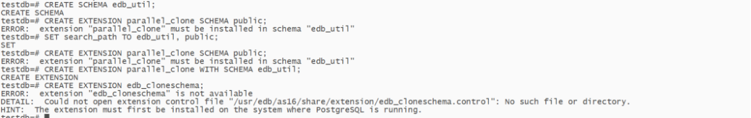 ERROR: extension "parallel_clone" must be installed in schema "edb_util"