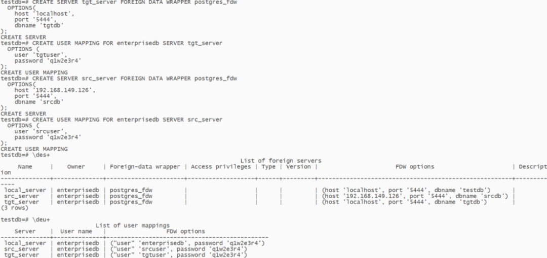 用户映射定义了外部服务器的连接和身份验证信息,您必须在目标/本地服务器的目标数据库中创建所有这些外部服务器和用户映射,为其定义用户映射的数据库用户必须是超级用户,并且在调用EDB克隆架构函数时连接到本地服务器的用户。