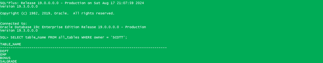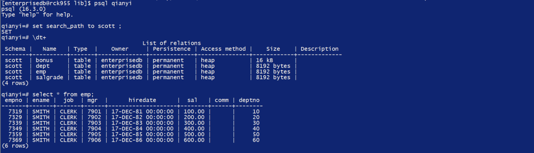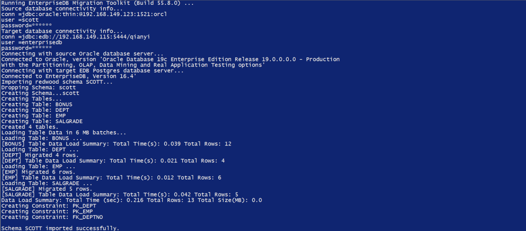 从Oracle 19C迁移到EDB EPAS(V16.4)四张表BONUS,DEPT,EMP,SALGRADE均成功。