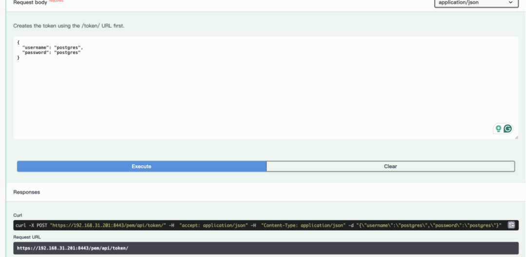 [nuser@pem1 ~]$ curl -k -iX POST "https://192.168.31.201:8443/pem/api/token/" \-H "accept: application/json" -H "Content-type: application/json" \-d "{\"username\":\"postgres\",\"password\":\"postgres\"}"