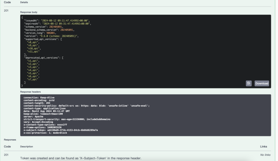 HTTP/1.1 201 CREATEDDate: Mon, 12 Aug 2024 08:49:32 GMTServer: ApacheContent-Length: 396X-Subject-Token: 932d9b1c-10e6-4285-b607-9b520f1ba8a2Vary: Accept-EncodingX-Frame-Options: SAMEORIGINContent-Security-Policy: default-src ws: https: data: blob: 'unsafe-inline' 'unsafe-eval';Strict-Transport-Security: max-age=31536000; includeSubDomainsX-Content-Type-Options: nosniffX-XSS-Protection: 1; mode=blockContent-Type: application/json{"issuedAt": "2024-08-12 08:49:32.894498+00:00", "expiresAt": "2024-08-12 09:09:32.894498+00:00", "schema_version": 202405091, "backend_schema_version": 202405091, "version_long": 906001, "version": "9.6.0 (schema: 202405091)", "supported_api_versions": ["v8_api", "v9_api", "v10_api", "v11_api"], "deprecated_api_versions": ["v1_api", "v2_api", "v3_api", "v4_api", "v5_api", "v6_api", "v7_api"]}