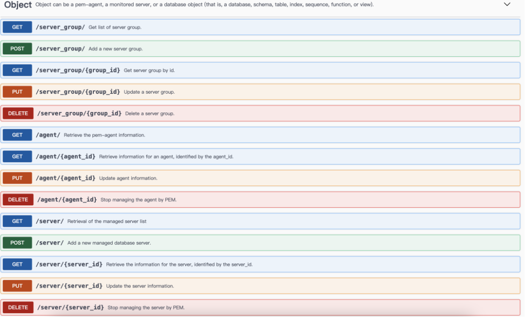 同时,EDB PEM企业管理器还提供了丰富的REST API功能。通过REST API功能提供有效的数据读写功能,这样可以无需登录PEM UI图形界面即可访问各种功能。而且可以通过REST API无缝与您现在的管理监控平台集成或整合。