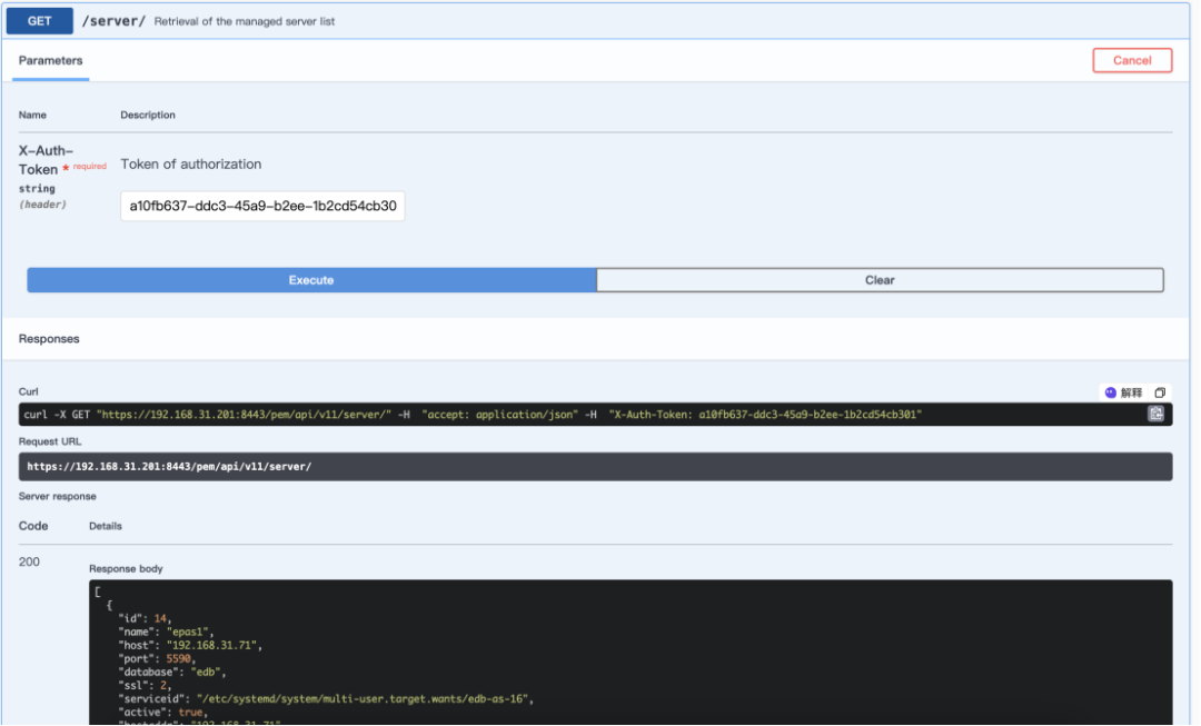 输入前面获得的token,点选【Execute】就可以返回所有被管理的Postgres Server的基本信息。如id、name、host、port、status等。
