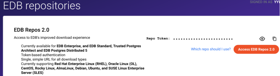 安装PGD 都需要一个EDB账户。如果没有EDB账户,可以注册一个免费账户。注册后,您就可以试用EDB软件库。注册后,进入EDB Repos 2.0页面,您可以在其中获取您的repo token。第一次访问此页面时,选择请求访问权限以生成您的存储库令牌。使用复制令牌图标复制令牌,并将其安全存储。