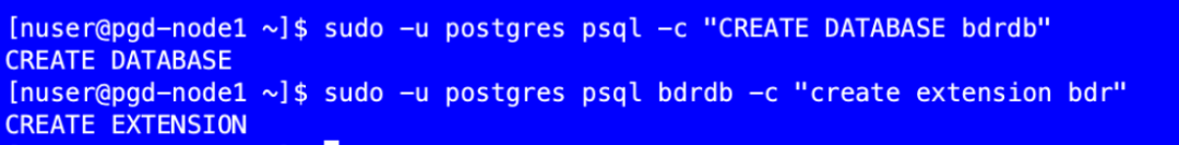 sudo -u postgres psql -c "CREATE DATABASE bdrdb"sudo -u postgres psql bdrdb -c "CREATE EXTENSION bdr"