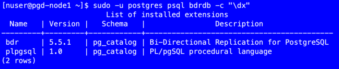[nuser@pgd-node1 ~]$ sudo -u postgres psql -c "select * from pg_available_extensions where name like 'bdr'"name | default_version | installed_version | comment------+-----------------+-------------------+-------------------------------------------bdr | 5.5.1 | | Bi-Directional Replication for PostgreSQL(1 row)