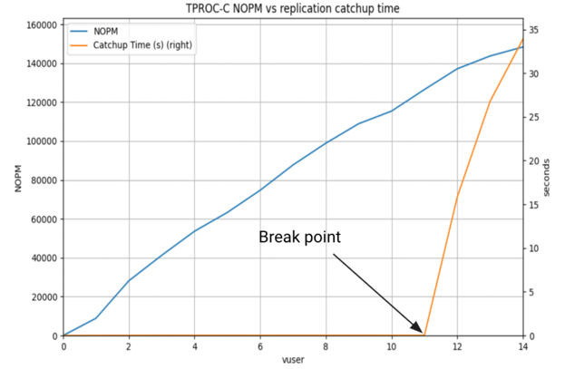 评估数据复制性能依赖于测量复制追赶时间。复制追赶时间以秒为单位,借助 OLTP 工作负载执行结束后立即执行的数据库函数来测量。该函数获取主节点当前的LSN位置,然后计算在数据复制过程中备用节点追上该初始LSN位置所需的时间间隔。