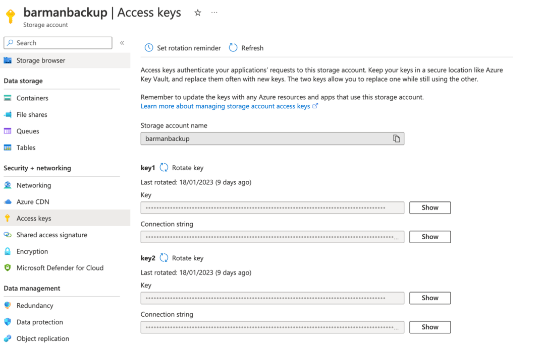 我们可以在存储帐户页面的左侧面板的“安全 + 网络”>“访问密钥”下找到相同的内容。