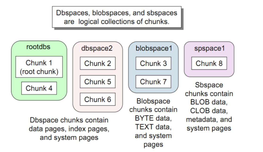 Dbspace、blobspace和sbspace是一个或多个chunks的逻辑集合。